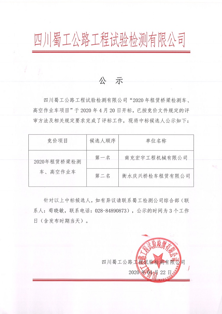 四川蜀工公路工程試驗檢測有限公司于2020年4月20日組織了2020年租賃橋梁檢測車、高空作業(yè)車項目開標、評標工作。現(xiàn)對評標結(jié)果予以公示,接受社會監(jiān)督。