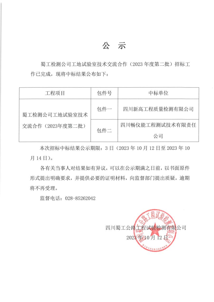 蜀工檢測(cè)公司工地試驗(yàn)室技術(shù)交流合作(2023年度第二批)中標(biāo)公示