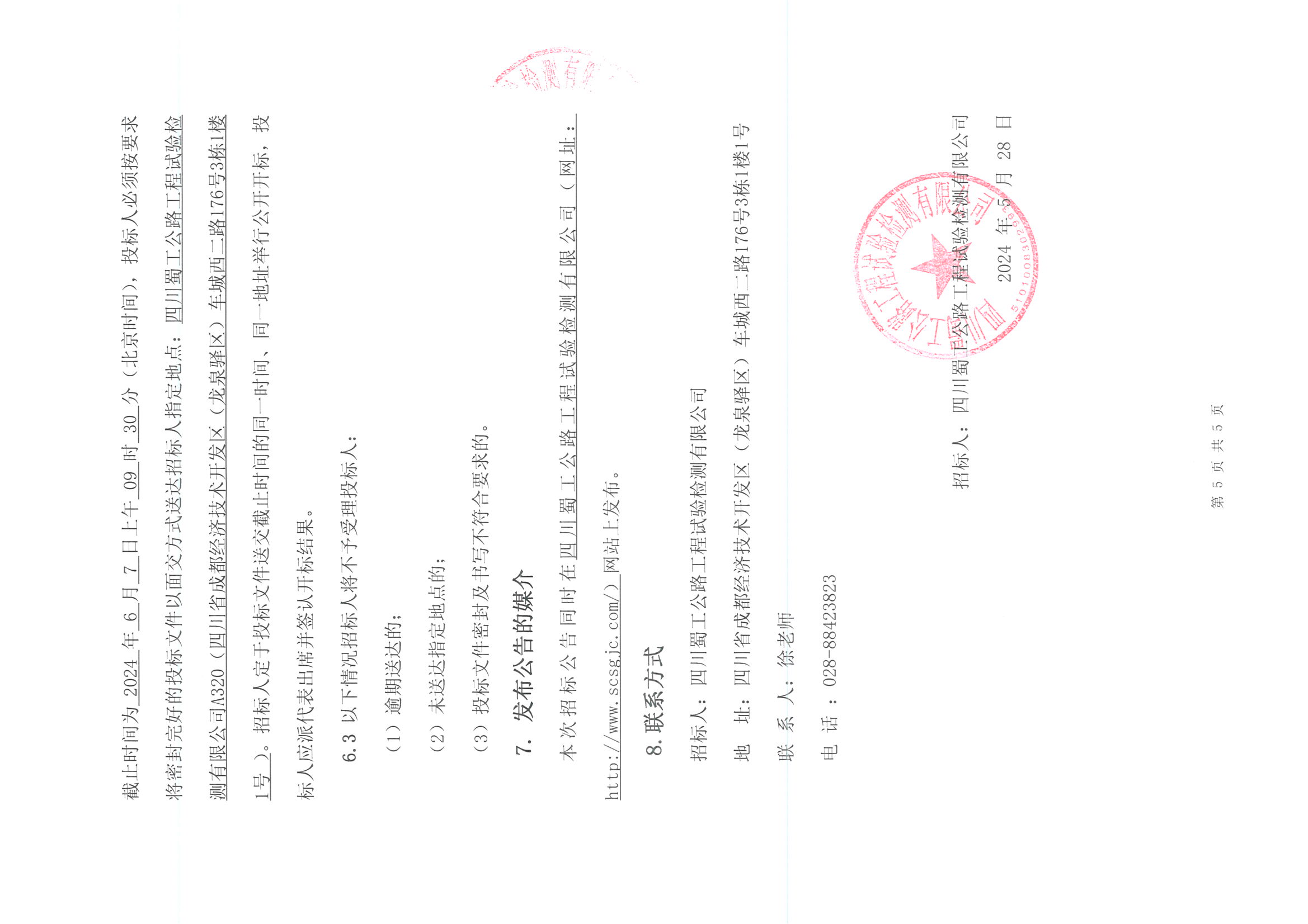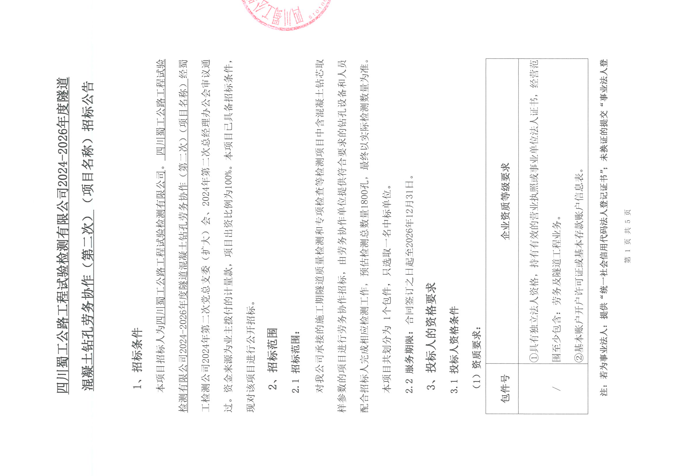四川蜀工公路工程試驗(yàn)檢測(cè)有限公司2024-2026年度隧道混凝土鉆孔勞務(wù)協(xié)作(第二次)招標(biāo)公告