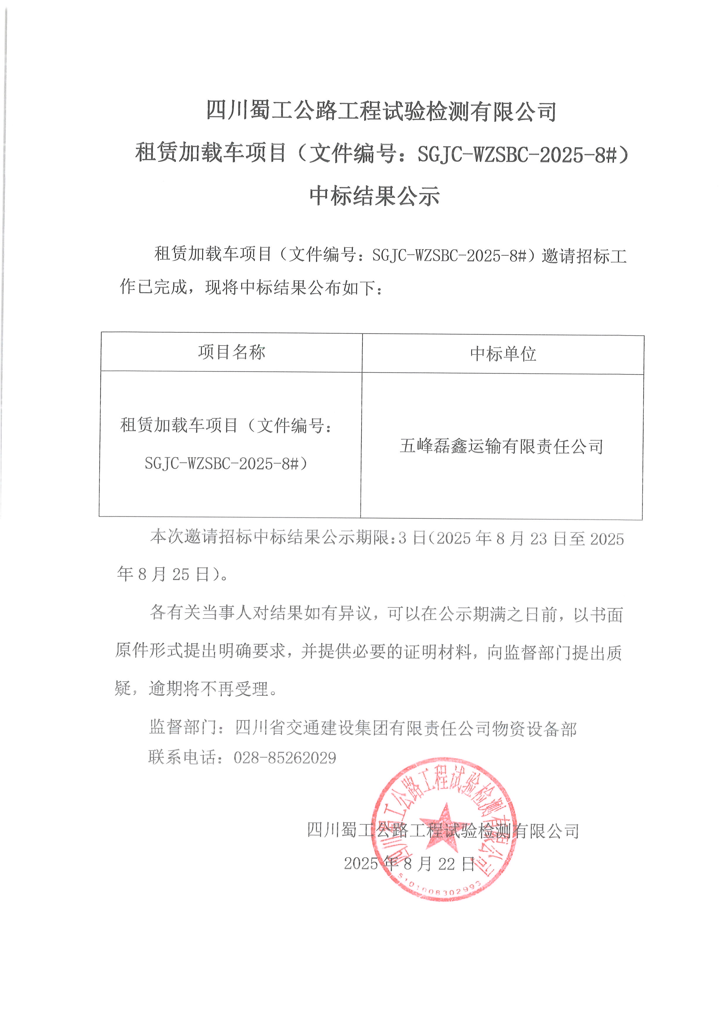 四川蜀工公路工程試驗檢測有限公司租賃加載車項目(文件編號:SGJC-WZSBC-2025-8#)中標結果公示