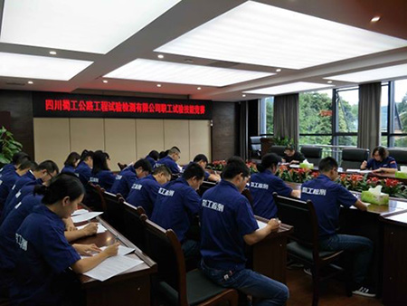 本次技能競(jìng)賽主要包含基本理論知識(shí)筆試和實(shí)際操作演練兩部分內(nèi)容,共計(jì)30余人參加?;纠碚撝R(shí)主要是考察試驗(yàn)人員對(duì)試驗(yàn)基本理論知識(shí),現(xiàn)行有效的行業(yè)以及國(guó)家標(biāo)準(zhǔn)規(guī)范對(duì)試驗(yàn)檢測(cè)的要求等知識(shí)的掌握水平;實(shí)際操作主要考核新增甲級(jí)參數(shù)的橋梁支座試驗(yàn)、瀝青SHRP試驗(yàn)、防水材料試驗(yàn)的試驗(yàn)演練,考核試驗(yàn)人員在從事相關(guān)試驗(yàn)檢測(cè)作業(yè)過(guò)程中的基本技能和分析、處理試驗(yàn)結(jié)果的能力。試驗(yàn)人員認(rèn)真的答題、專注的操作,用專業(yè)詮釋了工匠精神,充分展示公司試驗(yàn)檢測(cè)人員風(fēng)采,創(chuàng)造出了“比、學(xué)、趕、幫、超”的工作氛圍。